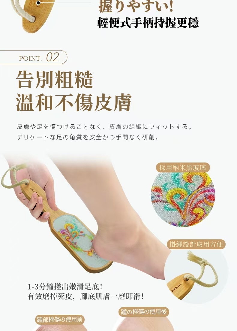·告別粗糙,溫和不傷皮膚——1~3分鐘搓出嫩滑足底,有效磨掉死皮,腳底肌膚恢復光滑。