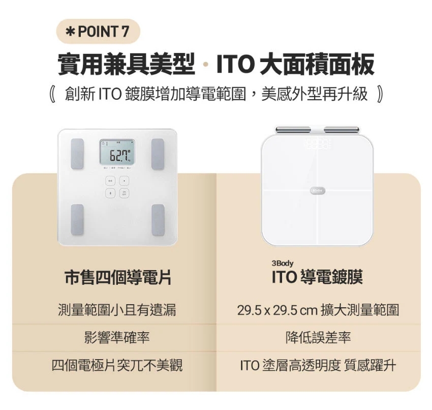 普通體脂計一般只使用4塊導電片,很容易因位置偏差而數據錯誤,而3Body整塊ITO面板都是導電範圍,將誤差降到最低。