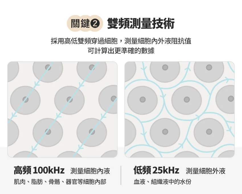 使用雙頻測量技術,高頻檢測細胞內液,低頻測量細胞外液的水分,從而透過不同的電阻抗性,富含水分的組織電阻相對較小,得知身體的含水量後,即可反推出其他身體數值。