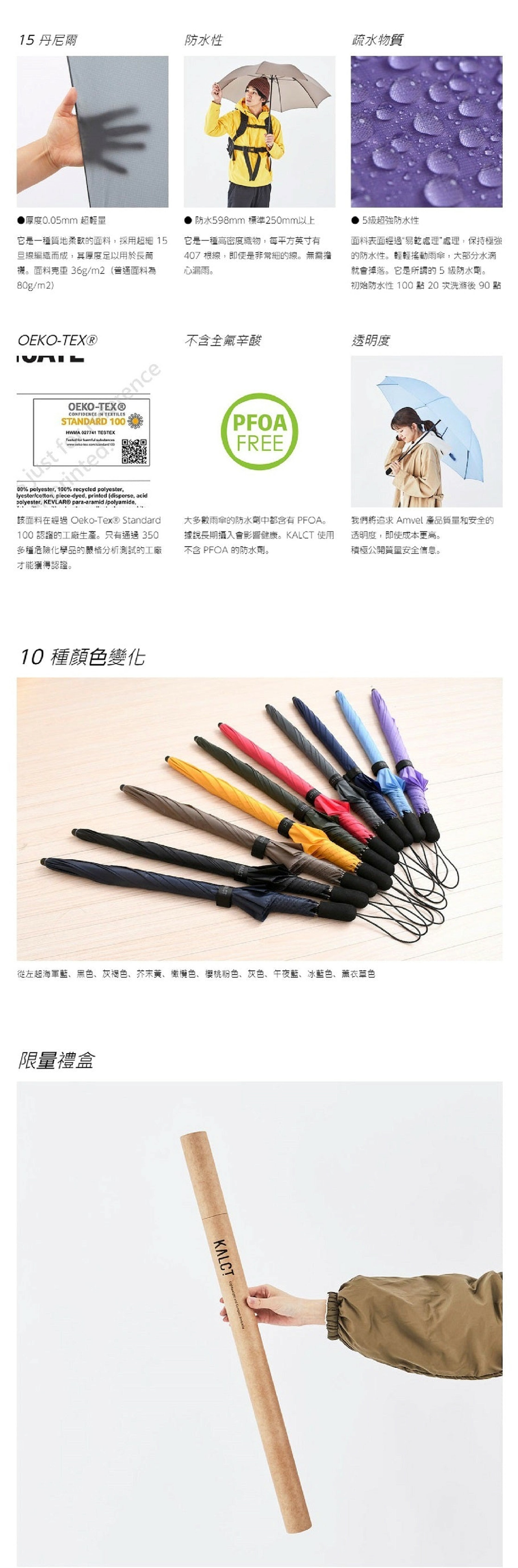 日本雨傘品牌Amvel推出全新的超輕雨傘─KALCT,傘骨採用了全碳纖維,在維持其輕量的情況下,也有抵抗強風強雨的堅固性。KALCT同樣使用了獨家的撥水技術「EasyDry」,納米性防水,雨水滴落會成水珠般落下,而且這種技術的防水持久性比其他防水技術強很多。