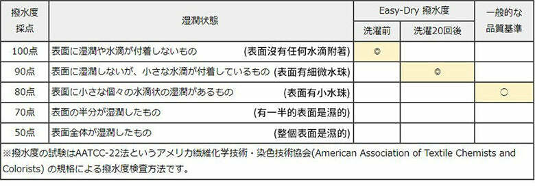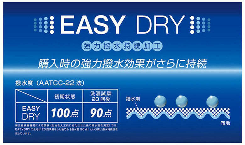經第三方檢查機構,實施人工劣化撥水測試,一般潑水測試僅水洗 3 次後為80分高潑水度,但 EASY-DRY材質在洗滌前為100分,經過20次以上的水洗,仍具有評價為90分的高潑水性,防水的效果絕佳!