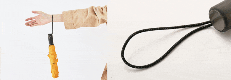 手提繩富有彈性,長度比一般的傘長 25cm,長度可輕易穿過成人的手腕。將反光線編織在手提繩中,在黑暗中發出微弱的光,在光線不足和物品散落的包中,可以更方便找到雨傘。
