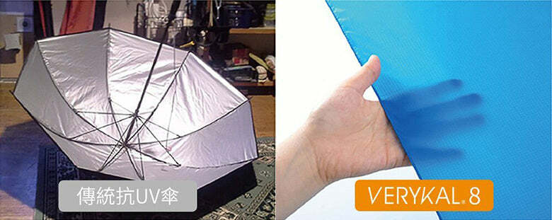 VERYKAL 8 採用的抗UV傘布,可以阻隔紫外線,波段外的可見光仍可通過,不聚焦、不反射,不只輕薄還能作為日常的遮陽傘使用,抗UV率最高達91%!