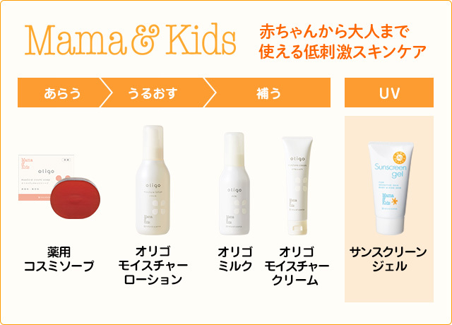 Mama & Kids是日本人氣No.1 護膚品牌。是由日本自然科學株式會社與皮膚科、產科、小兒皮膚科專家共同研究開發、專門針對孕產婦、新生兒及嬰幼兒時期的敏感嬌嫩肌膚而設計的低刺激高功能護膚用品。整個品牌產品本著無合成香精、無色素添加的原則,通過了由專家進行的品質及安全性能的測試。在產品成分方面,嚴格選擇了不但適用於敏感肌膚的原料,而且有助於促進皮膚與生俱來的滋潤能力。以從黑砂糖中提取的寡糖為中心,嚴格精選有機橄欖和黑珍珠等天然原材料,並從中萃取精華,再結合最先端的科學技術,使之可以長時間停留肌膚內部,促進肌膚的新陳代謝。產品中淡淡的黃色和甜香味均為天然寡糖所特有的顏色和香味。產品從開發研製,到製造,全部由日本自然科學株式會社管理,並且為了保證品質,目前尚未在日本以外設立分公司,也就是說產品完全為日本製造。並且考慮到安全性能以及環保問題,專門使用輕便而又不易破碎的容器,以及使用了簡易密封包裝。