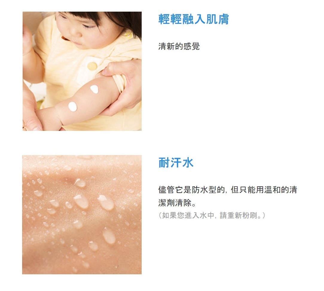 保濕成份配方,有效防禦紫外線同時保持肌膚濕潤,使用低刺激性的潔膚液輕易清洗乾淨。