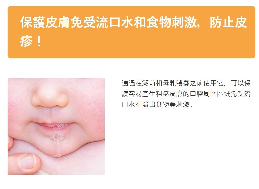 寶寶出牙期,口水欲旺盛,經常流口水,一直擦拭會使寶寶的口周嬌嫩皮膚紅腫,誘發口水疹濕疹。