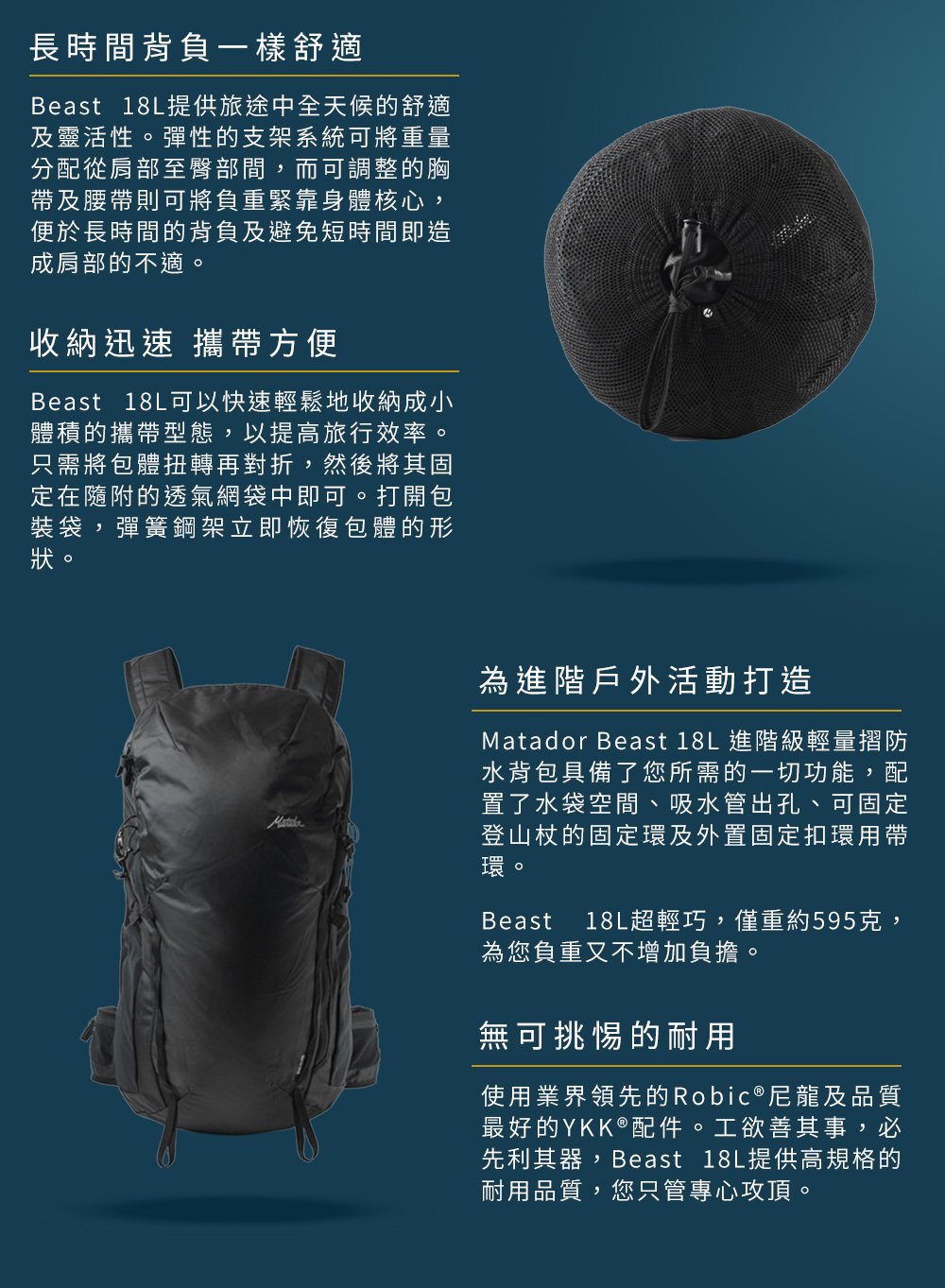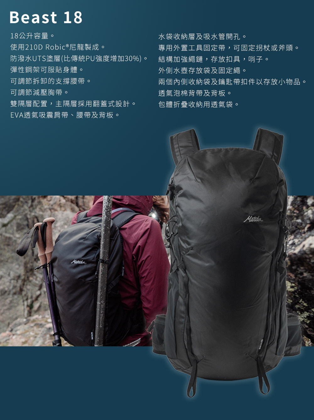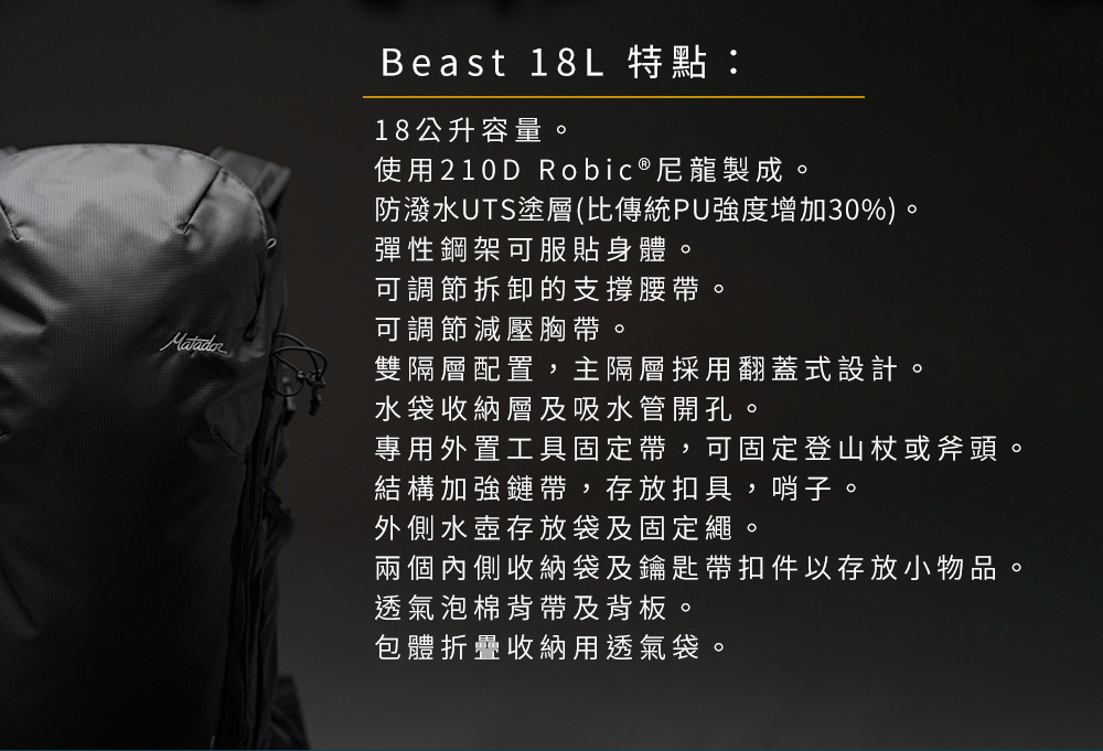 美國Matador Beast18 超輕多功能背包是專為戶外技術追求而設計。靈活的框架懸掛系統可在移動時提供支撐和扭轉,同時仍然允許將行李打包小以方便旅行。這款功能齊全的高山背包由Robic®織物製成,並用UTS塗層加固,具有防風雨和耐用性。