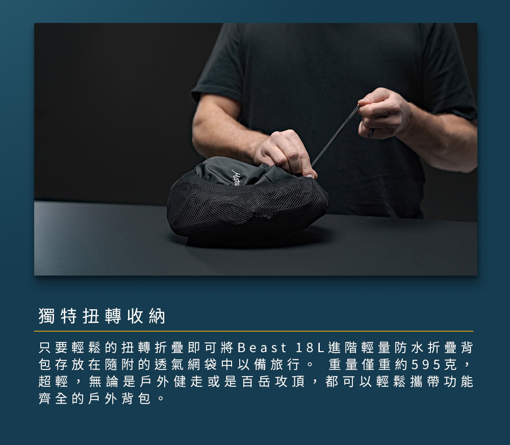 Beast18可以快速,輕鬆地收拾小東西,以提高旅行效率。只需將包裝對折並對折,然後將其固定在隨附的壓縮袋中即可。打開包裝袋,彈簧鋼框架將立即恢復包裝的形狀。