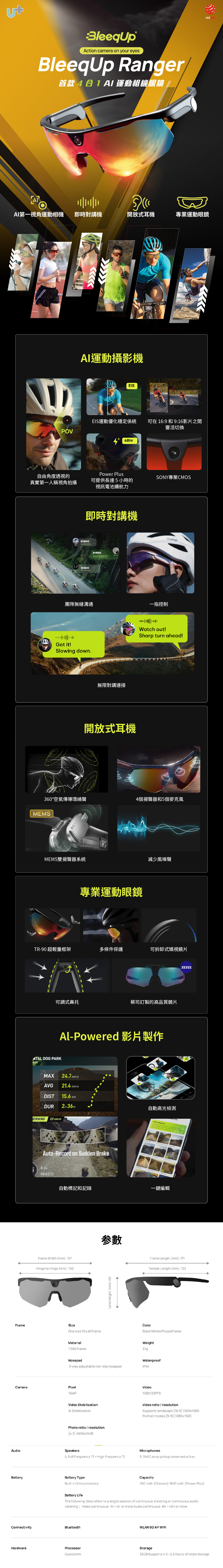 BleeqUp Ranger 是一款專為戶外運動設計的四合一 AI 智能運動眼鏡,結合高清運動相機、開放式耳機、即時對講與專業護目鏡功能。