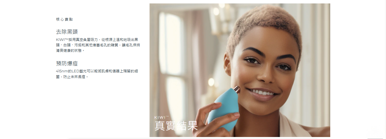 KIWI™ 採用創新真空淨吸科技,能溫和且有效地將黑頭連根拔除,不傷害肌膚。