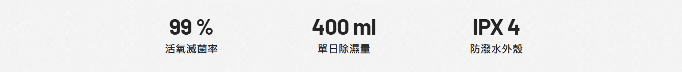 除濕能力: 約 400ml/日(30°C / 80%RH)