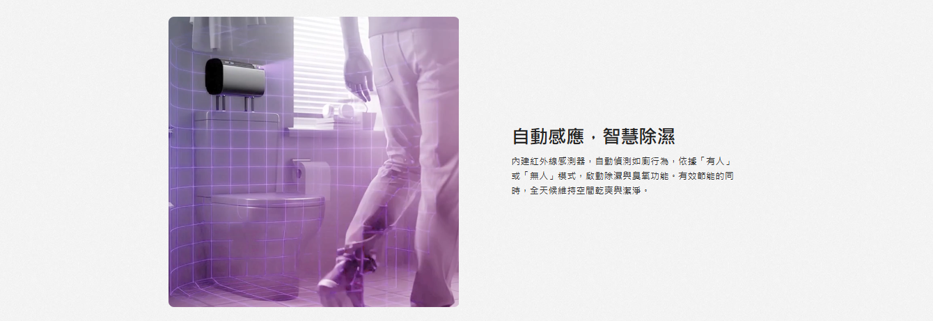 內建紅外線感測器,自動偵測如廁行為,依據「有人」或「無人」模式,啟動除濕與臭氧功能。
