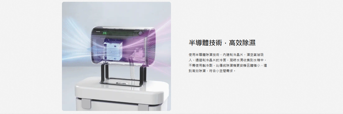 不需使用製冷劑,比傳統除濕機更安靜且體積小,達到高效除濕,符合小空間需求。