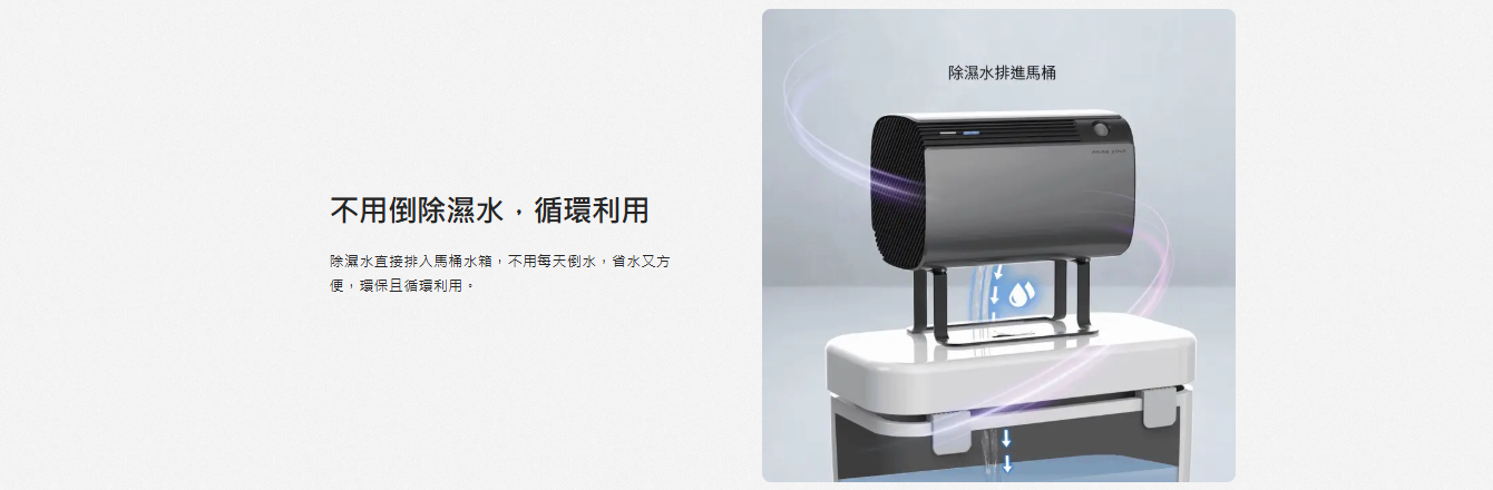 除濕水直接排入馬桶水箱,不用每天倒水,省水又方便,環保且循環利用。