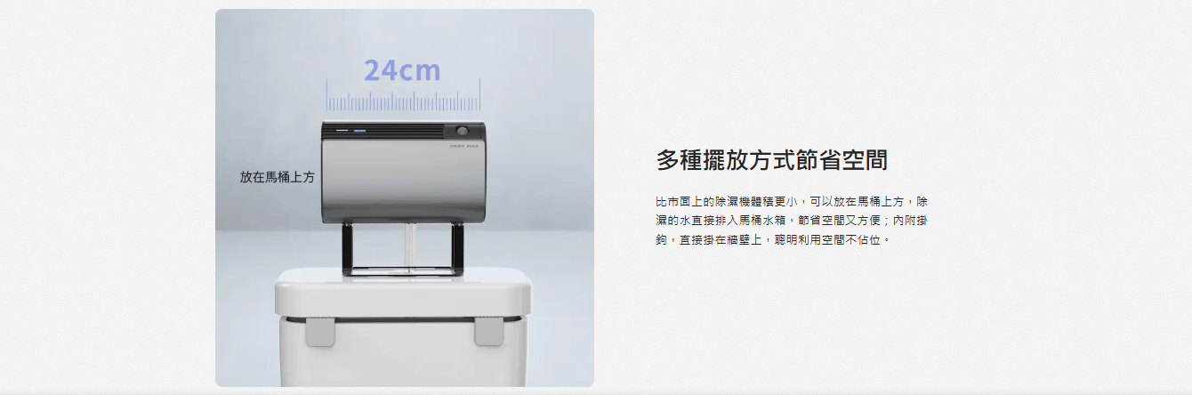 比市面上的除濕機體積更小,可以放在馬桶上方,除濕的水直接排入馬桶水箱,節省空間又方便;