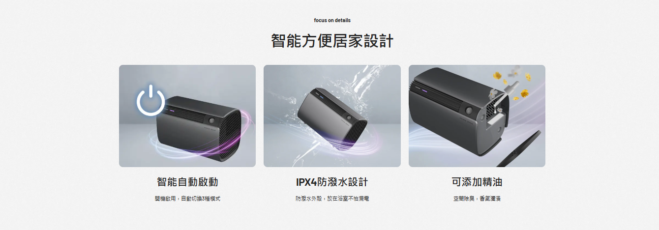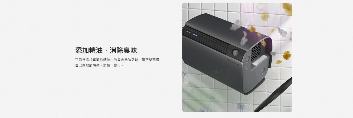 可自行添加喜歡的精油,除溼去霉味之餘,讓空間充滿自己喜歡的味道,放鬆一整天。
