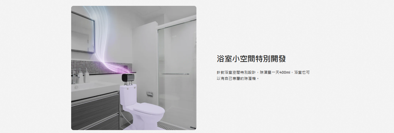 針對浴室空間特別設計,除濕量一天400ml,浴室也可以有自己專屬的除溼機。