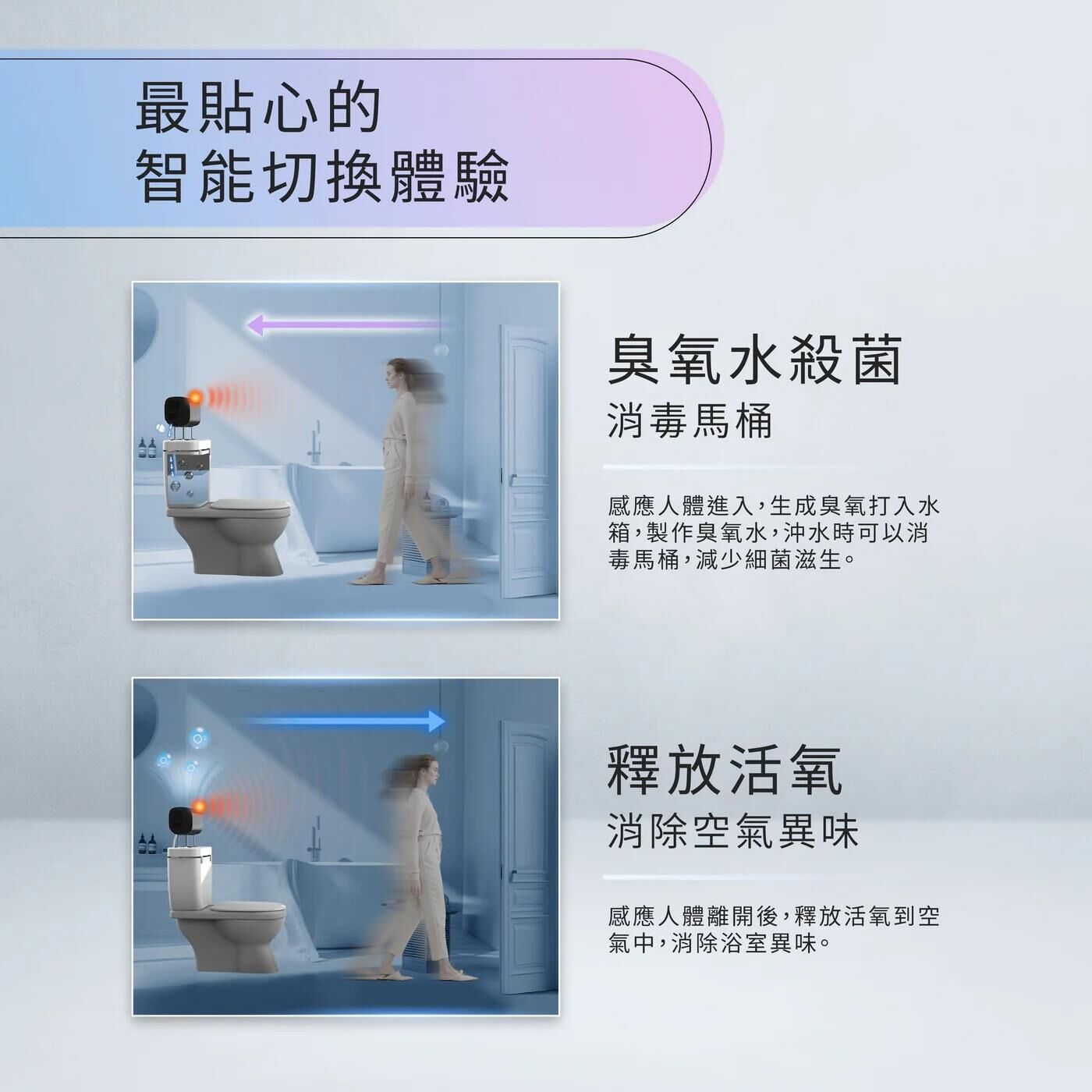 如廁時:紅外線感應人靠近時,會自動製作臭氧水打入馬桶水箱,沖水時殺菌消毒馬桶,避免細菌滋生