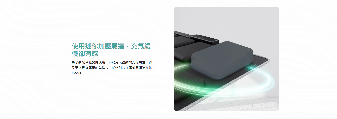 為了要配合睡覺時使用,不能用太強勁的充氣馬達,卻又要充足夠厚實的氣進去,就特別將加壓式馬達迷你縮小移植。