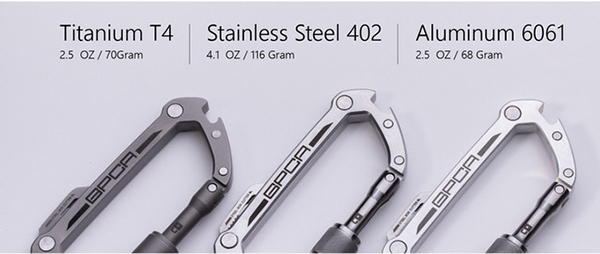 目前提供鋁、不銹鋼、鈦三種不同材質選擇,不銹鋼和鈦版本的登山扣在表面防刮的表現更加出色,不鏽鋼材質的重量較重。