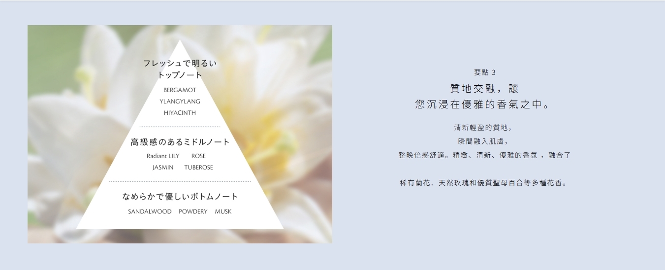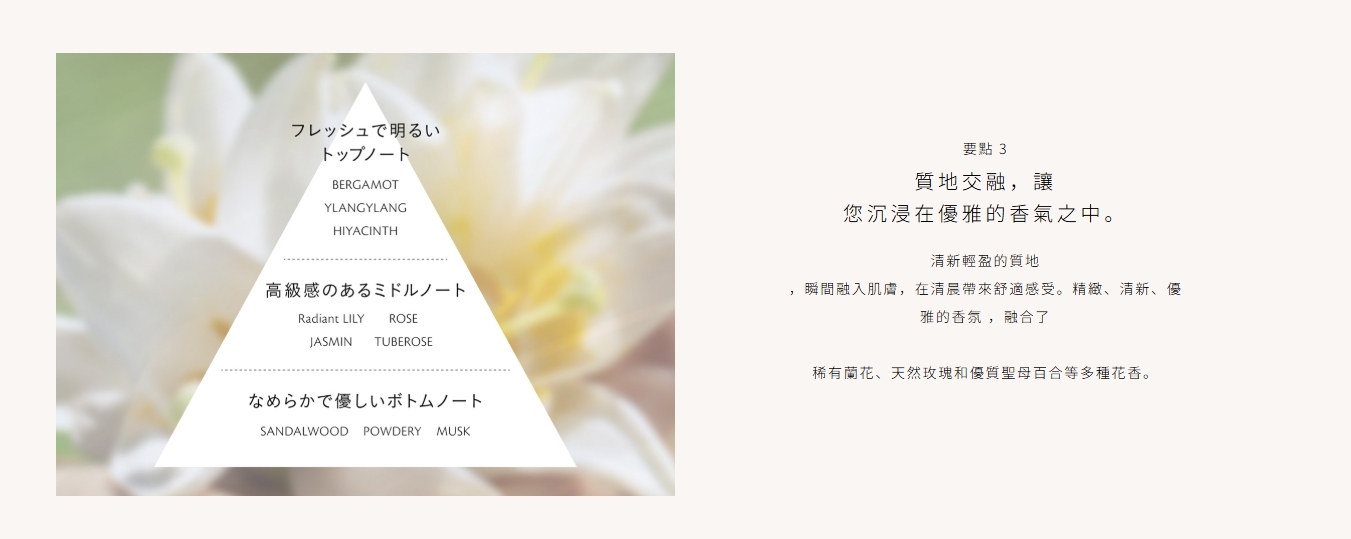 淡雅的芳香糅合矜罕的蘭花和天然玫瑰,將你包圍於細緻宜人的香氣之中。