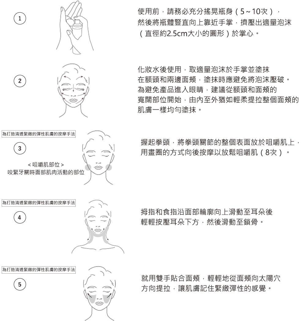 從任何角度細看,呈現美麗細膩膚質。注入「提拉泡沫配方」,全面覆蓋肌膚表面後形成「提拉薄膜」包緊肌膚。泡沬配方帶來柔滑清澈如露水般的質感,並達致肌膚緊緻和提拉的感覺。締造光滑、緊緻、清澈明亮的彈性肌膚。