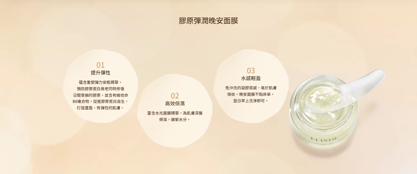 藉由膠原蛋白GL成分,於睡眠期間修護肌膚在白天受到的損傷,隔晨賦予肌膚彈力與光澤。