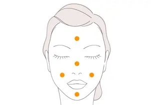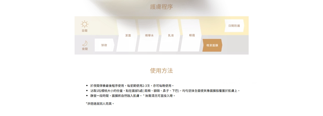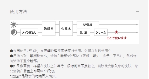 夜間護理結束時,用抹刀取1顆櫻桃大小,塗於面部5個部位(兩頰、額頭、鼻子、下巴),均勻塗抹於全臉。