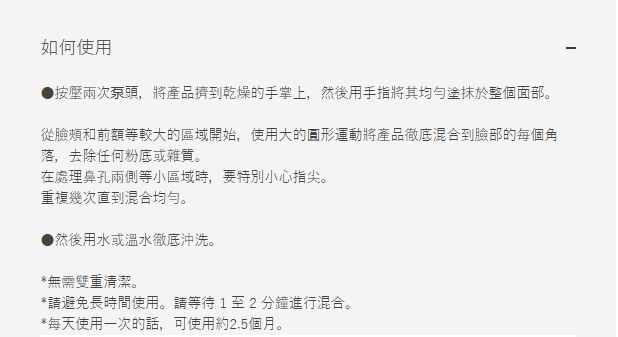 在乾燥的手法上,反覆兩次的量,用拇指將其塗抹在整個臉部