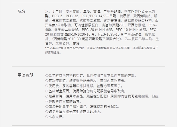 西洋菜提取物,肌醇等能更好的提高保濕效果,液體質地清爽不油膩。