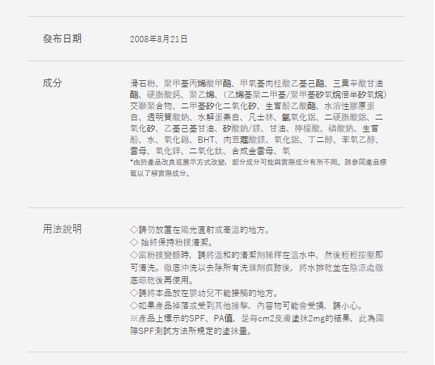 光澤粉末溫和遮蓋暗沉、膚色不均等肌膚問題,同時保持剛塗抹時的肌膚透明美感。