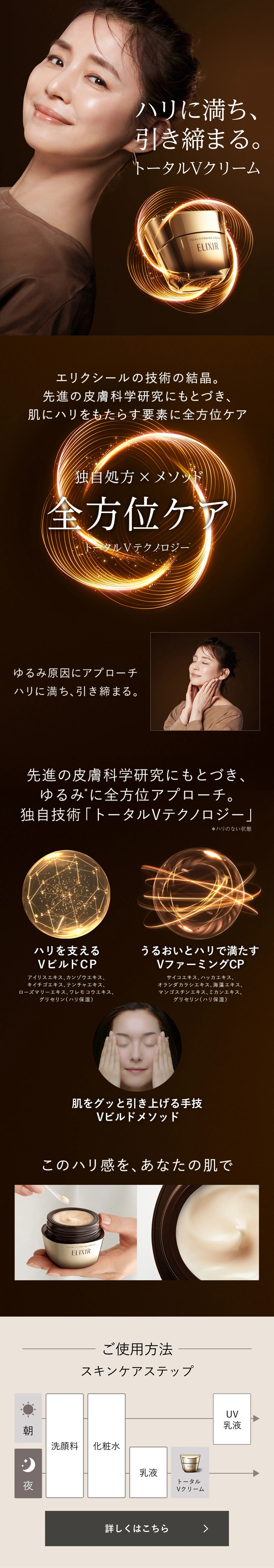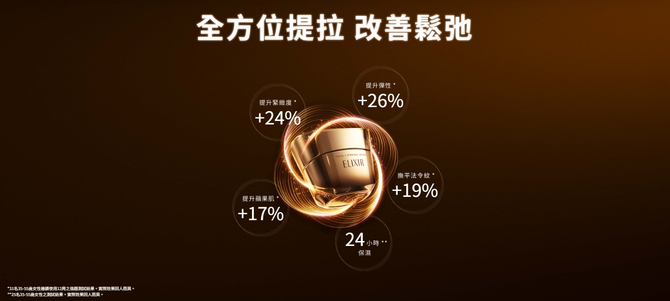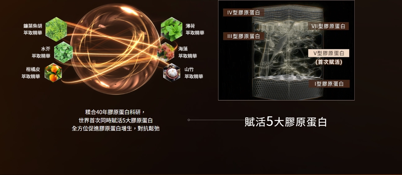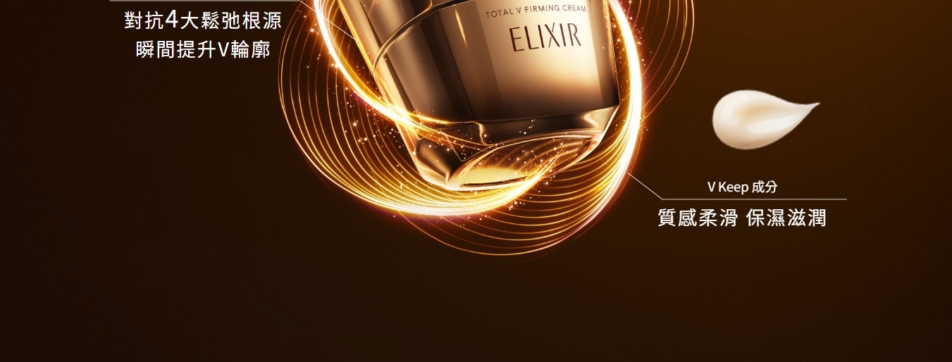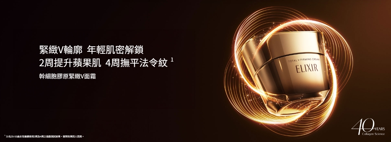 ● V型膠原精華-獨家創新成分,賦活肌膚中關鍵5大膠原蛋白,是ELIXIR怡麗絲爾系列產品首次賦活V型膠原蛋白,同時也是資生堂集團内首次同時賦活5種膠原蛋白