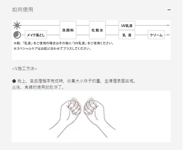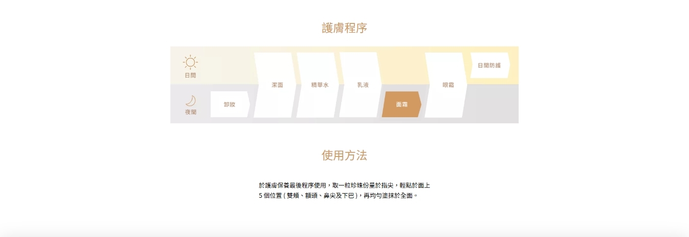 ● 在晚上保養最後一程序,取1粒珍珠大小的量 均勻塗抹全臉。