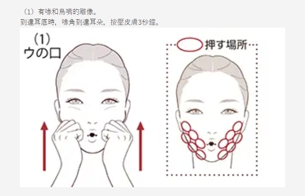 ② 噘起嘴巴做出U型嘴型,按壓肌膚並向上拉提維持3秒。沿著下巴到耳朵從嘴角到耳朵兩側,每個動作慢慢移動,依序向上拉提3處。