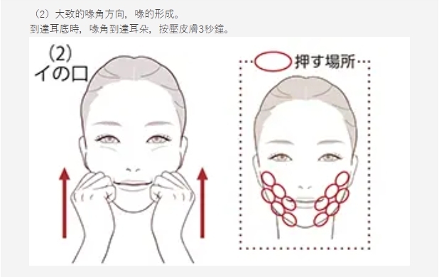③ 將嘴角向左右延伸做出一的嘴型 按壓肌膚並向上拉提維持3秒。沿著下巴到耳朵從嘴角到耳朵兩側每個動作慢慢移動,依序向上拉提3處。