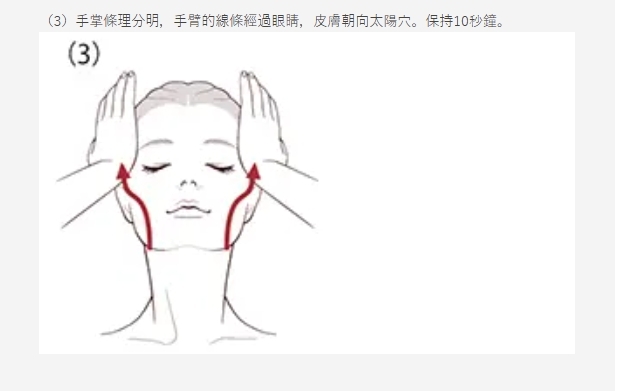 ④ 運用整個手掌,從輪廓線開始朝著眼下、太陽穴方向上拉提肌膚,並維持 10 秒鐘。