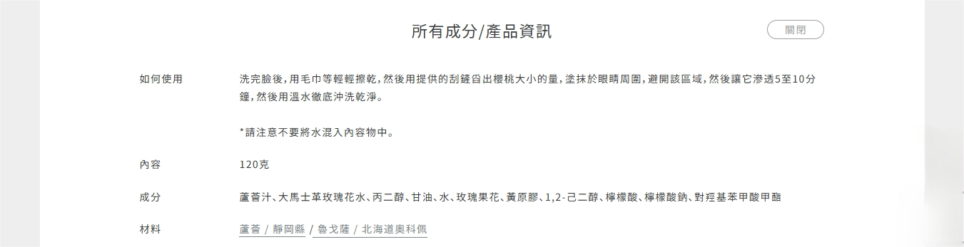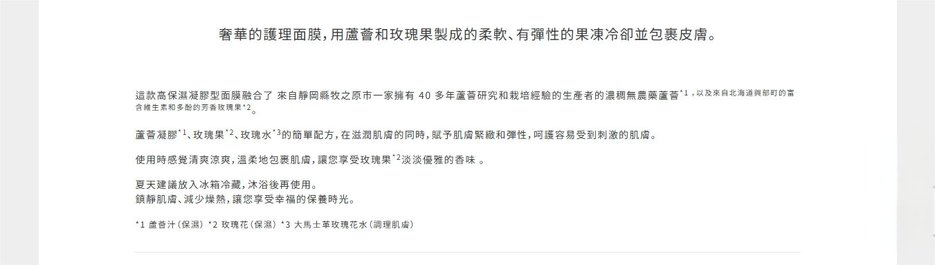 栽培蘆薈長達40年以上經驗的靜岡縣木之原市農家們所培育,具有濃稠精華的無農藥蘆薈,與富含維他命與多酚,帶有濃厚香氣的北海道興部町產玫瑰所製成凍狀高保濕面膜。