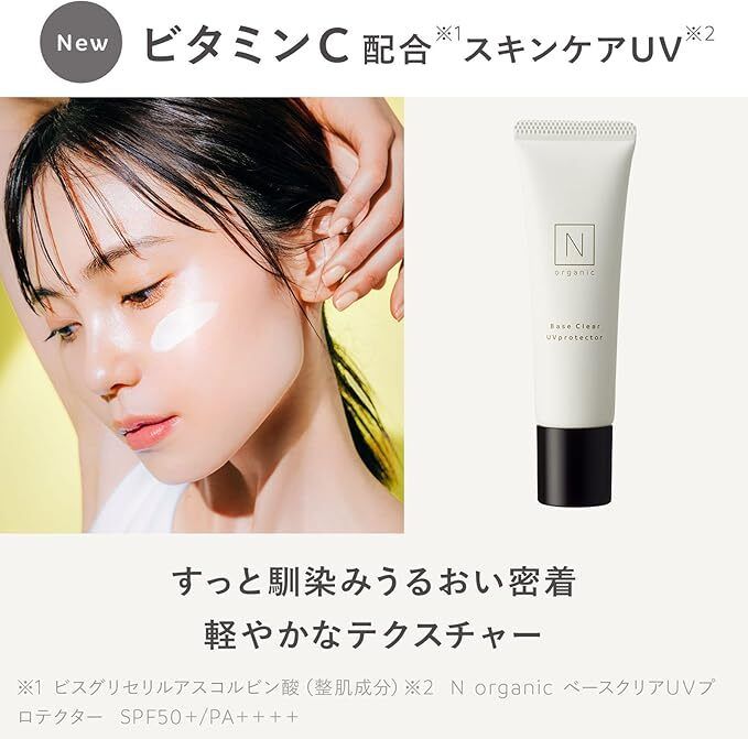 N 有機基底透明防曬霜質地輕盈,可抵禦紫外線和外部壓力*3,同時遮蓋皮膚不平衡*3和毛孔*1 。