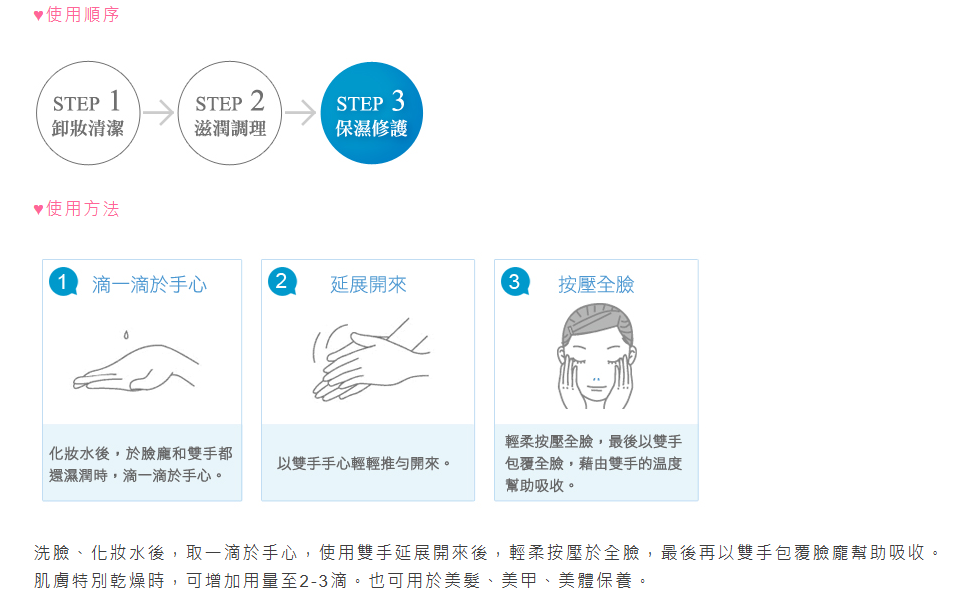 ♥身體保養:可取2~3滴加少量水分擦於全身,或是沐浴後肌膚上的水滴未乾時使用。