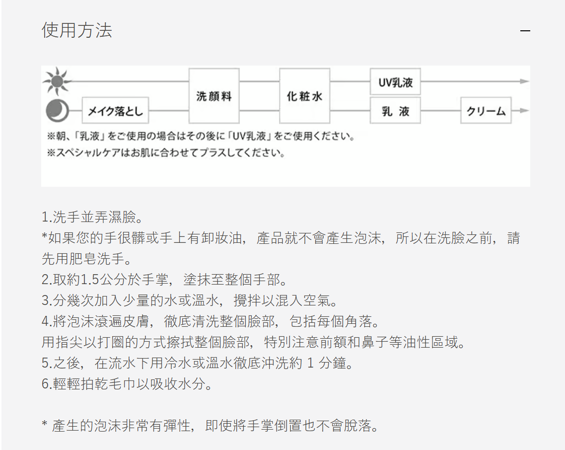 泡沫中含有添加維生素C的顆粒,去除老化角質及造成肌膚負擔的油脂與污垢。