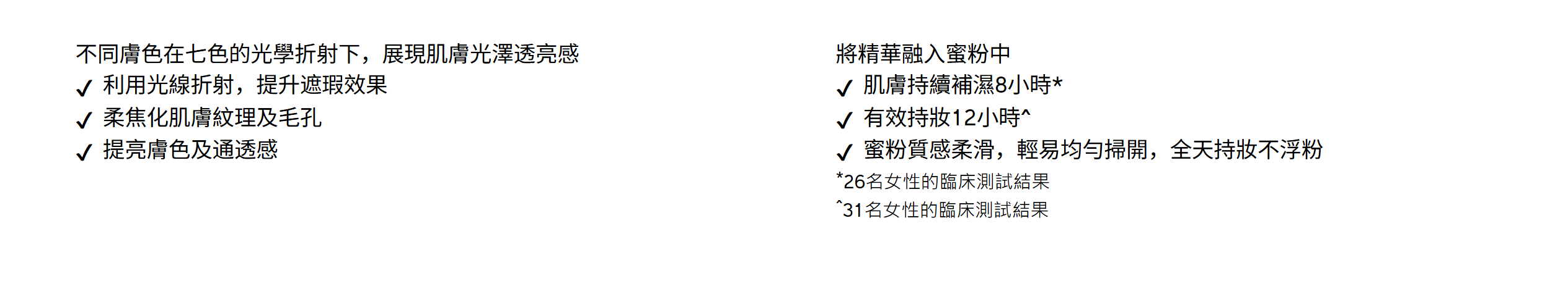 肌膚持續補濕8小時1,有效持妝12小時2,同時蜜粉質感柔滑,輕易均勻掃開,全天持妝不浮粉。