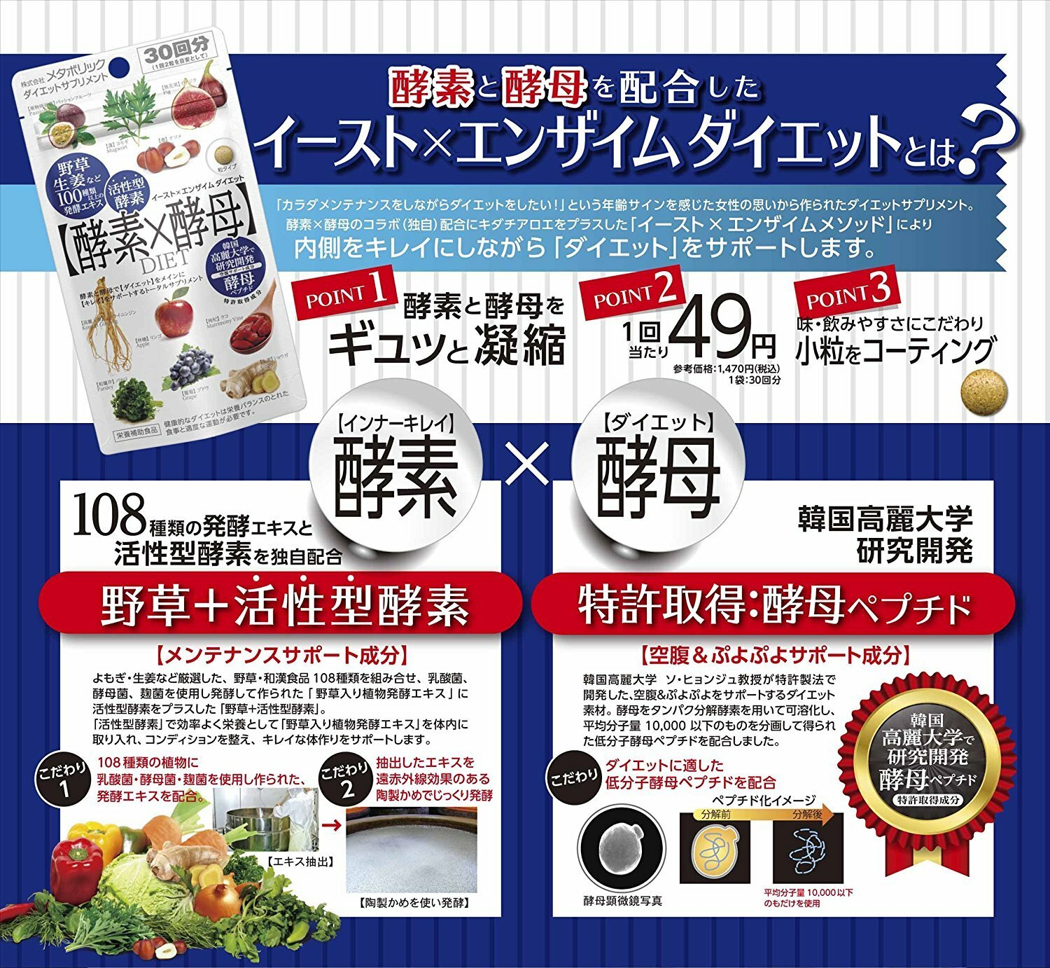 這款商品是一款以酵素和酵母為主要成分,並添加了植物乳酸菌和美容成分的產品。它專注於內部美容和支持肌膚水潤彈性,讓您在減肥的同時也能享受美麗的支援。