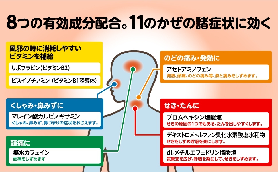 有效緩和各種感冒引起的身體不適,如流鼻水、鼻塞、打噴嚏、喉嚨痛、咳嗽、生痰、寒惡、發燒、頭痛、關節痛、肌肉疼痛等11個感冒症狀。