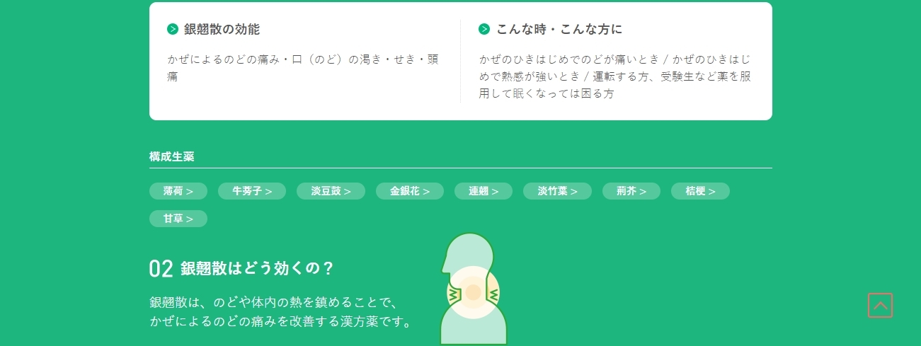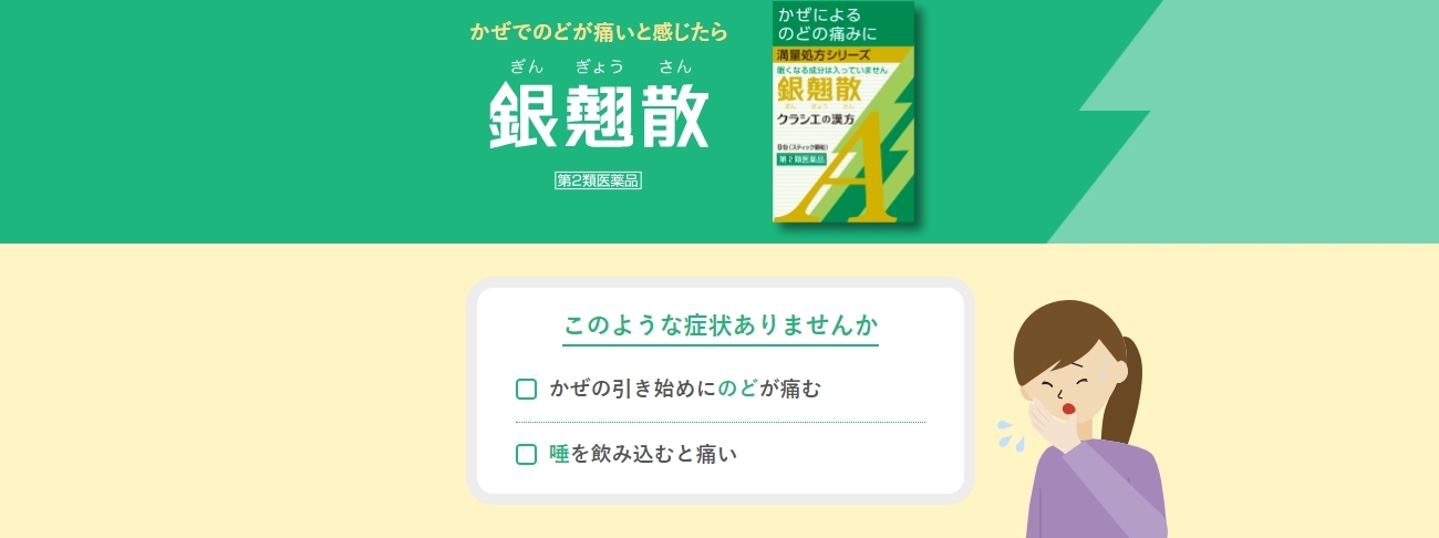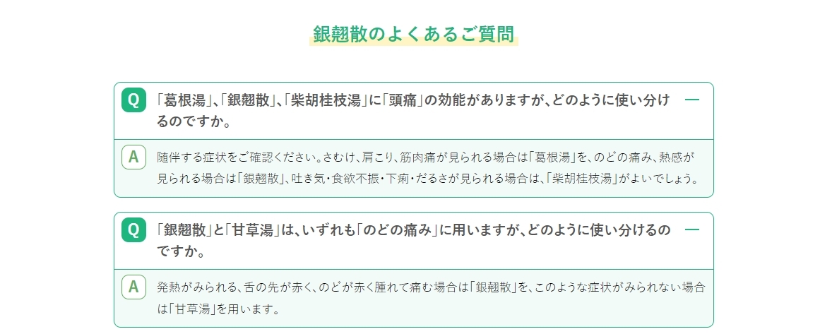 銀杏散適合治療喉嚨痛、口乾、想喝水等症狀。它與Kakkonto類似,都是在感冒症狀開始出現時服用,但Kakkonto對寒冷的感冒有效,而Ginkyosan則適合喉嚨痛的人。喉嚨痛不僅在乾燥的冬季最容易發生,而且在經常使用空調的夏季,房間可能會過於乾燥,因此調節濕度很重要。