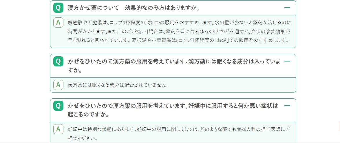 A:我們建議將 Ginkyosan 和 Gokoto 與約 1 杯水一起服用。如果水量少,藥物溶解的時間會較長。另外,如果你有喉嚨痛,據說如果將藥物放入口中,慢慢地通過喉嚨,症狀會改善得更快。 我們建議將Kakkonto和Shoseiryuto與約1杯熱水一起服用。