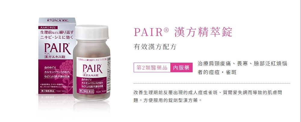 『PIAR』是專門針對『成人痘』所設計的配方。隨著年齡增長,歲月逼迫我們脫離青春期,邁入社會。然而明明年紀都已經超過25歲,都不太好意思再說自己青春年華,但痘痘卻還是不斷的冒出來,而且一出現就難以根治,同一個位置反覆發生,這可能不是青春痘,而是『成人痘』。和青春痘不一樣,25歲之後出現的痘痘往往來自於生活中的壓力、不良習慣、荷爾蒙失調等等原因。漢方精萃錠能改善生理期前反覆出現的成人痘或雀斑、賀爾蒙失調而導致的肌膚問題,是方便服用的錠劑型漢方藥。