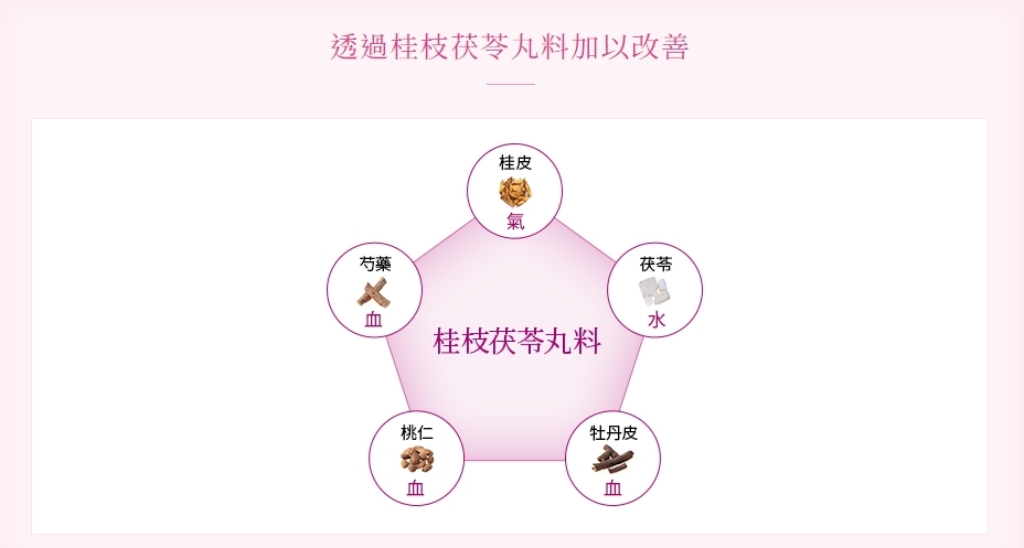 5種生藥製成的漢方「桂枝茯苓丸」改善血液迴圈,桂皮,茯苓, 牡丹皮,桃仁,芍薬5種生藥處方,有效緩解荷爾蒙紊亂引起的痘痘,肝斑。對肩膀僵硬,生理痛,生理不順也有顯著效果。