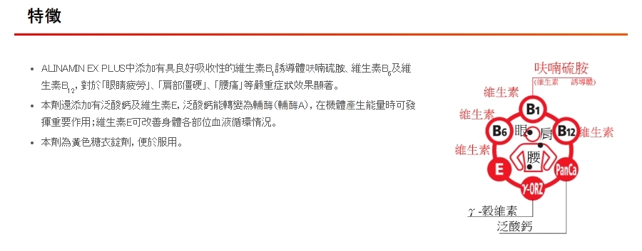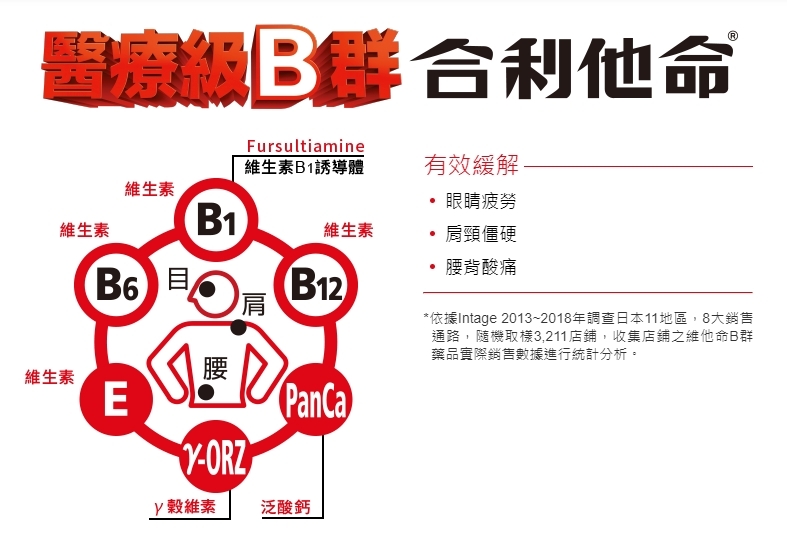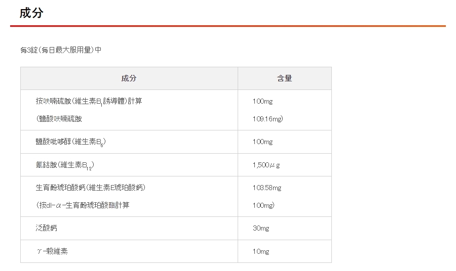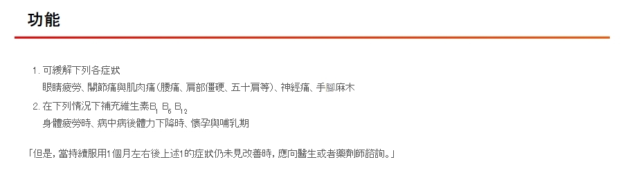 ●此產品混合了維生素B1衍生物、維生素B6和維生素B12,對於眼睛疲勞、肩頸緊張、腰部疼痛等症狀具有卓越的效果。