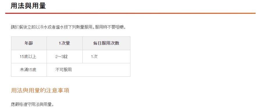 飯後立即用水或溫水服用以下量,不要咀嚼。