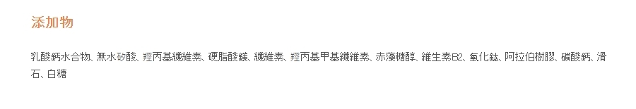 添加劑:乳酸鈣水合物,二氧化矽,羥丙基纖維素,